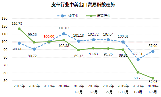 2020年1-6月皮革行业中美出口贸易指数52.95