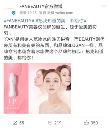 带货女王范冰冰进军化妆品领域 自创美容仪品牌FANBEAUTY。