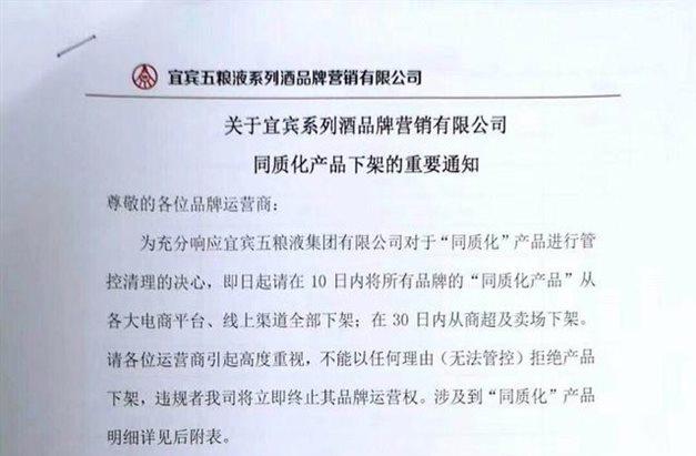 新京报讯(记者 王子扬)4月8日,落款为宜宾五粮液系列酒品牌营销有限公司的一份关于该公司“同质化产品”下架的通知显示,该公司要求各品牌运营商10日内在电商平台和线上渠道,30日内在各商超渠道下架所有品牌的共73款“同质化产品”,违规者将立即终止品牌运营授权。