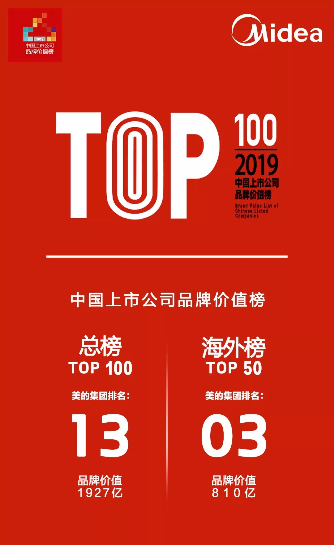 同日,由清华大学经济管理学院中国企业研究中心及每日经济新闻共同发布的“2019中国上市公司品牌价值榜”发布。本次公布的“2019年中国上市公司品牌价值榜”包括总榜Top100,海外榜Top50,新锐榜Top50,其中,美的位列总榜第13名、海外榜第3名。