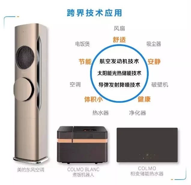 此外,跨界技术的引入是美的研发中一大创新突破:将航空发动机技术、太阳能光热储能技术、导弹发射降噪技术应用到家电产品中,通过将数字化设计技术引入到全线多达20个品类的研发过程中,大幅度缩短从技术概念到产品落地的周期,以人工智能技术赋予机器感知、认识、决策、思考的能力。