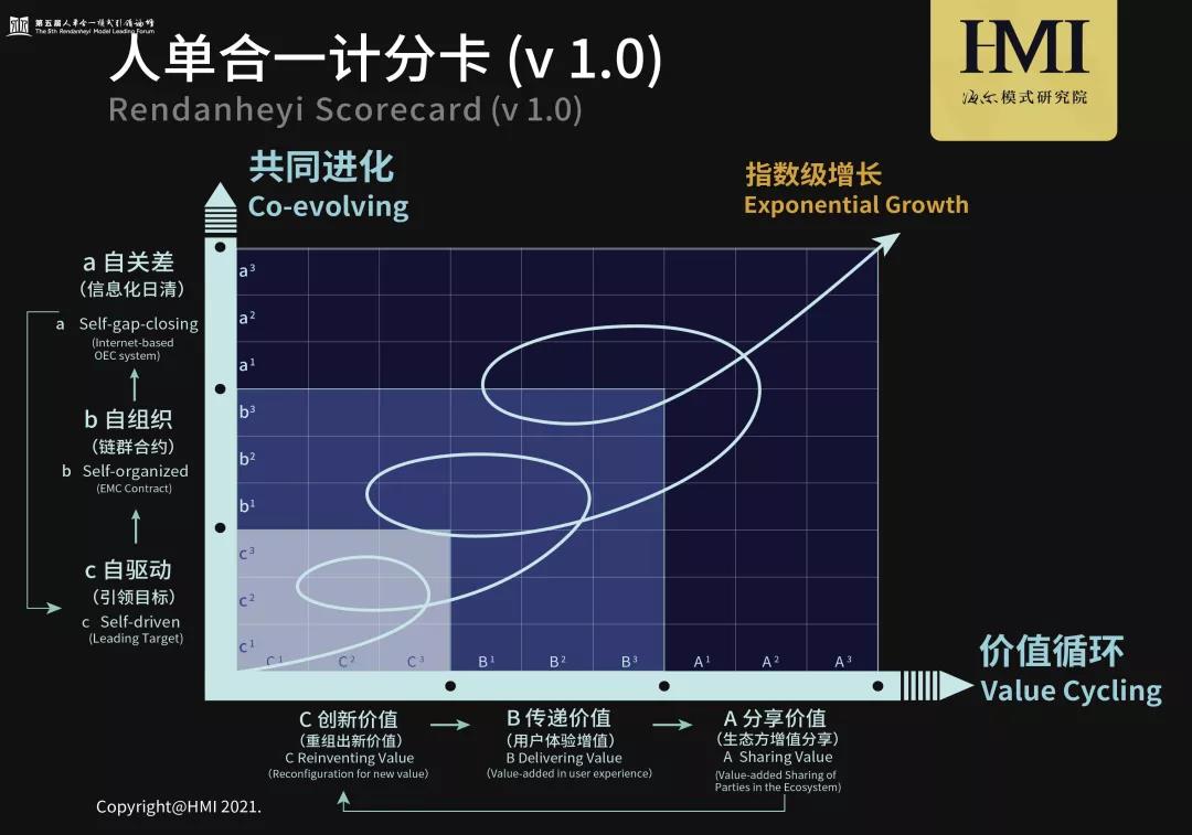 欧洲管理发展基金会推出的人单合一认证是以人单合一的计分卡为蓝本。人单合一计分卡的纵轴和横轴是两个循环:纵轴是共同进化,以链群合约为中心,根据用户需求确立引领目标,有了引领目标后,链群合约来承接,并通过信息化日清来关差,关差后,再确立一个新的引领目标,形成循环。横轴是价值循环,从创新价值,再到重组出新的价值,并传递价值,传递后根据用户反馈再创造,创造的价值由参与的各方来分享,分享后再来创造更新的价值,这是一个价值循环。横纵轴共同作用最终实现指数级的增长。