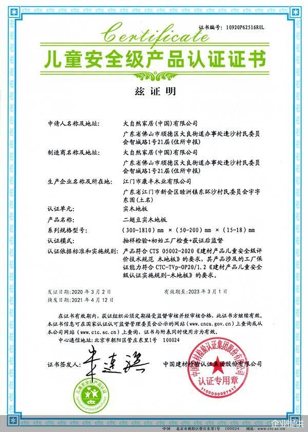 大自然木地板获得儿童安全级产品认证