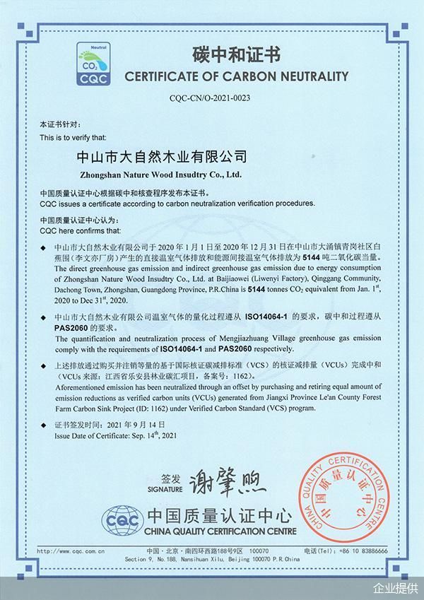 大自然家居率先获得CQC颁发的碳中和证书