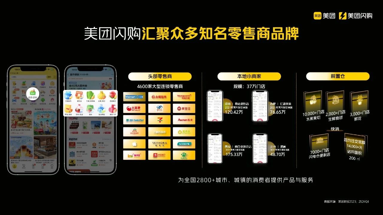 此外,我们还拥有一种独特的业态——前置仓。大多数人可能找不到前置仓,因为它们不是街边店铺,也不对外营业,其所有订单几乎全部来自于即时零售平台,骑手会在30分钟内将商品送到用户手中。因此,这些前置仓通常位于偏僻位置,但商品种类丰富,服务质量优异,且24小时营业,以满足用户全天候的需求。前置仓这种业态在这两三年间迅速增长,200万家商店支持我们在2800个城市和县市的布局,这些商家为用户提供各种商品和服务。这就是美团闪购所涵盖的商家范围。