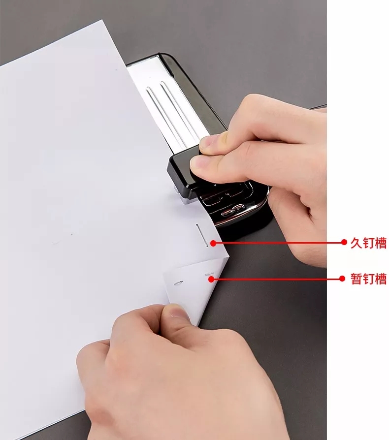 可根据不同的装订需求,45°选择暂时钉,旋转90°装订永久钉。暂时钉钉角朝外留有缺口,方便拔出;永久钉钉角朝内,不易散落,利于保存装订好的文件。