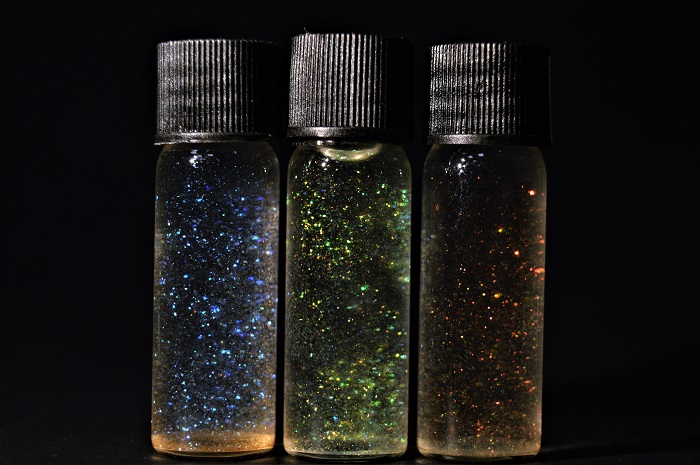 他们的材料可用来替代化妆品中广泛使用的塑料闪光颗粒和微小的矿物颜料。传统颜料,如日常使用的闪光粉,属于不可持续材料,而且会污染土壤和海洋。一般的颜料矿物必须在800℃的高温下加热才能形成颜料颗粒,这也不利于自然环境。