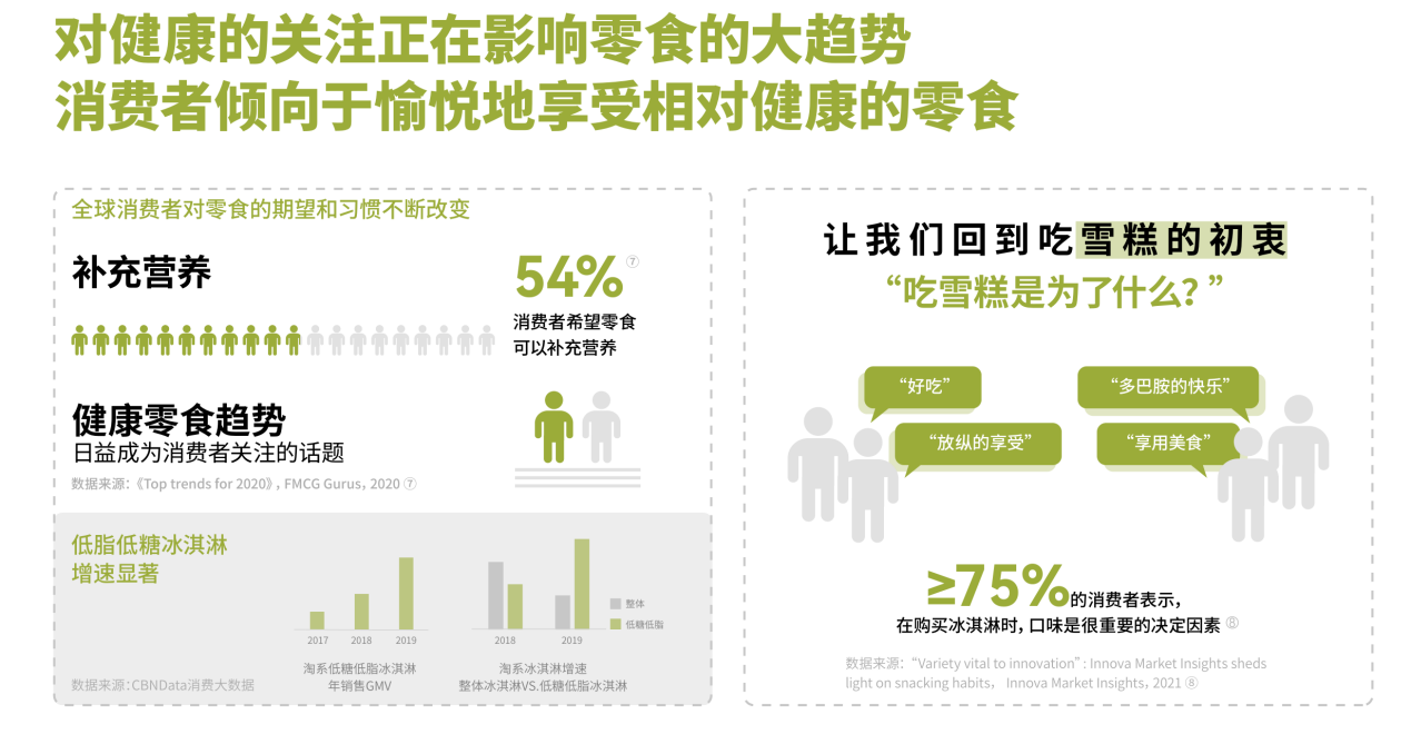 《报告》内容显示,消费者倾向于愉悦的享受相对健康的零食,根据相关调查数据,75%的消费者在购买冰淇淋时认为口味是重要的决定因素;超5成的消费者期望零食可以补充营养,并且愿意从传统零食转移到高蛋白、低糖零食。