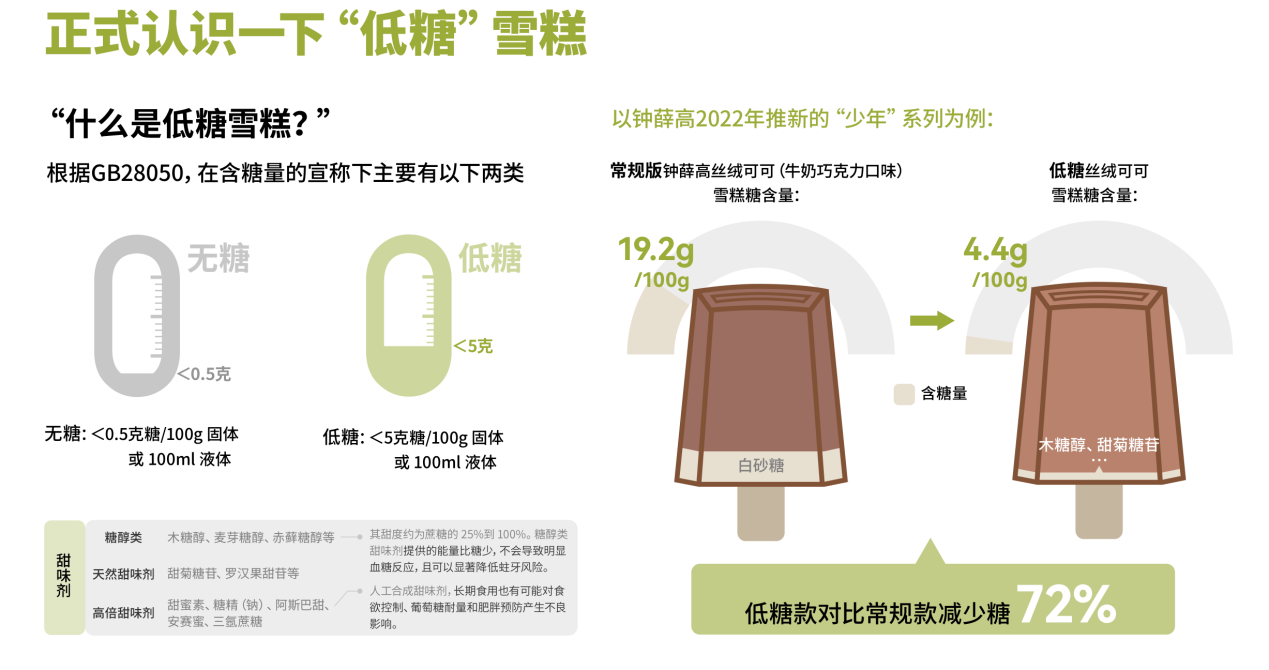 《报告》展示了钟薛高案例,其配料表相对简洁,前三位多使用稀奶油和牛奶等优质原料,近期联合国家奥林匹克体育中心共同研发推出的“少年”系列产品,在保持雪糕好口味的前提下,兼顾了低脂、低糖、高蛋白等元素,其中低糖丝绒可可雪糕含糖量4.4g/100g,低脂番石榴椰子雪糕一片雪糕热量仅84千卡。