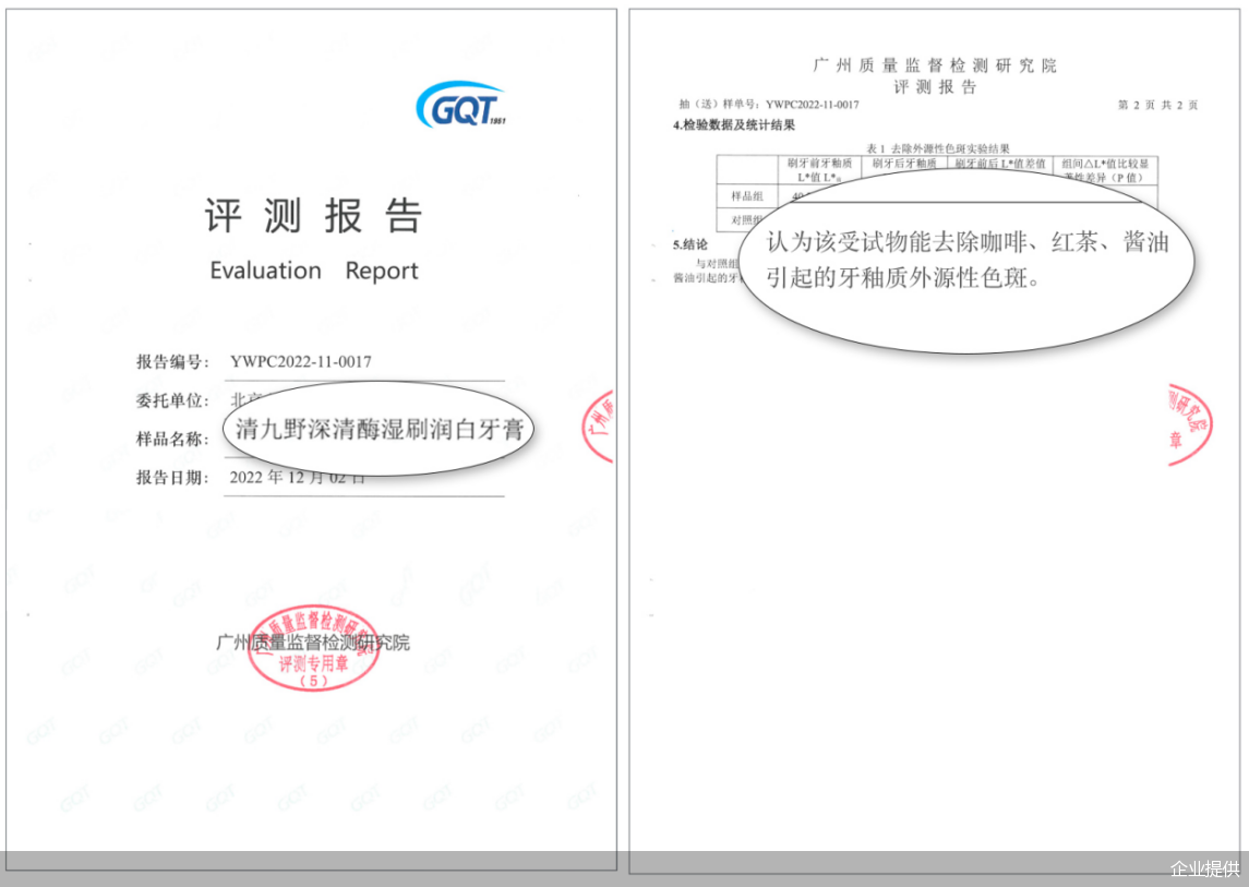 图:清九野深清酶湿刷润白牙膏的去除牙釉质外源性色斑功效已通过广州质检院评测