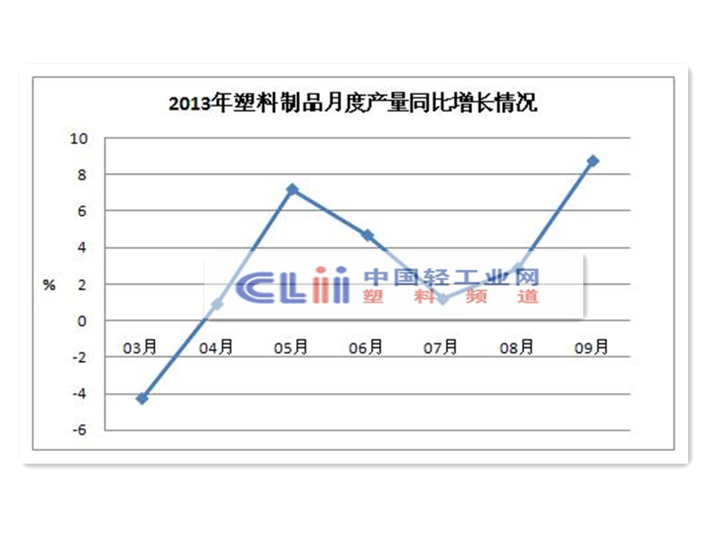 据国家统计局公布的工业主要产品产量统计数据,2013年1月~9月,塑料制品行业规模以上企业累计完成产量4460万吨,同比增长8.8%。累计增速比1-8月提高1.4个百分点。其中:9月份完成产量558.5万吨,同比增长8.7%,增速比8月提高5.9个百分点,月度塑料制品产量增幅自今年7月份以来已连续两个月回升。