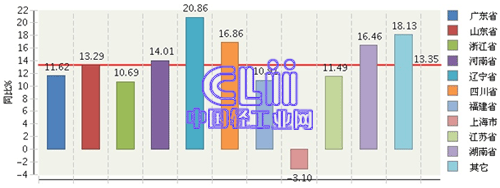 图7 2013年1~9月主要地区家具行业规模以上企业累计主营业务收入增速情况