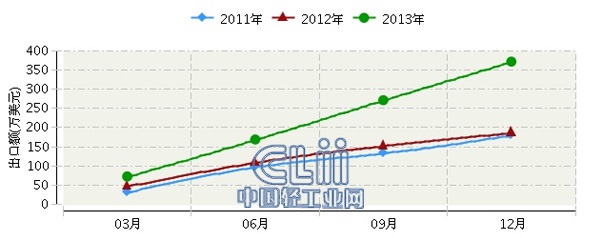 从出口贸易方式看,以一般贸易为主,完成累计出口额369.96万美元,占全部出口额的99.52%。从近三年累计出口额年度对比情况看,2013年4季度累计出口额和增速均创三年来最高值。