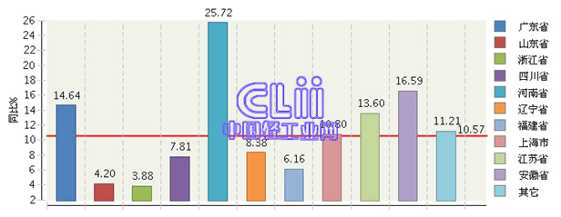 上述十个地区中,河南的累计主营业务收入增速(下同)最快,为25.72%;安徽、广东、江苏及上海的增速超过了10%,且在全国家具行业的平均线以上;其他5个地区的增速均为个位数增长(图7)。与2013年同期相比,广东、四川、河南、上海及江苏的增速出现了不同程度的提高。