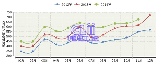 图3 2014年1~11月家具行业规模以上企业月度主营业务收入及增速
