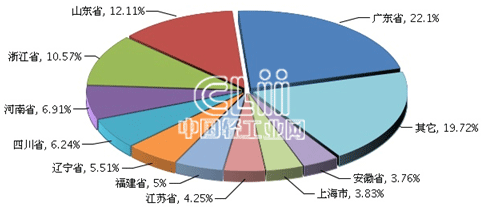 1~11月,家具行业累计主营业务收入居全国前10位的地区排名与1~10月相同,没有发生变化;前10个地区的累计主营业务收入合计占比达到了80.28%。前三位地区中,广东的累计主营业务收入(下同)占22.10%,山东占12.11%,浙江占10.57%(图6)。