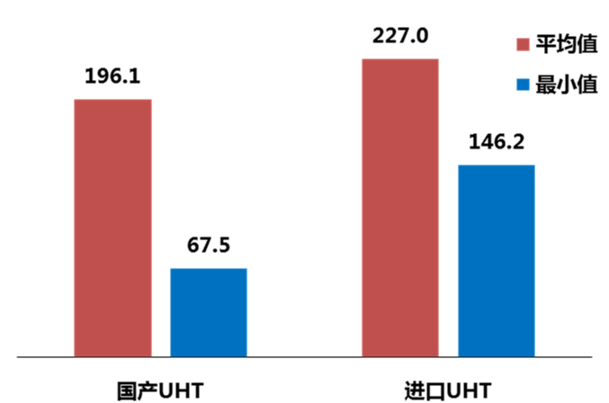《报告》汇集了2015年我国南北方23个城市的巴氏杀菌奶、常温奶和部分调制奶等液态奶的调研情况。研究结果表明,112批次国产常温奶中糠氨酸的平均值为每100克蛋白质196.1毫克,46批次进口UHT灭菌奶中糠氨酸的平均值为每100克蛋白质227.0毫克,显著高于国产品牌(p<0.05)。