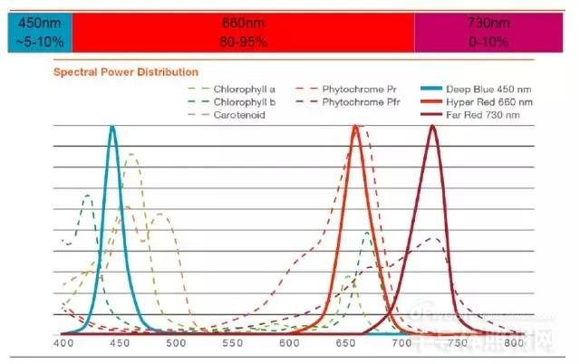 经过研究,我们得出:LED波长应该在主要深蓝色450nm、红光660nm、远红光730nm,通过这几个光谱不同的组合来帮助植物快速生长。