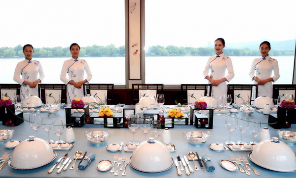 徐尧林说,这二个国宴餐具系列的命名分别寓意着东道主杭州对于世界的拥抱和面向世界的祝福。作品的外表均圆润饱满、精致大方,而在图案设计创意上,前者以“海潮”代表中国与世界的交流,以鎏金代表礼仪,表达祥瑞气息,后者以荷花为图案,采中国传统如意纹饰,辅以纯金线勾勒增加灵动感。