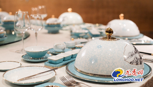 据介绍,此次餐瓷装饰上传统吉祥花纹为盛于隋唐时期的“宝相花”,传达了吉祥、美满的寓意,辅助图案为“唐草纹” 和“海浪纹”,传达了陆上海上丝绸之路的概念;器型显著位置选用的 “富春山居图”,则展现了中国传统的山水艺术文化。