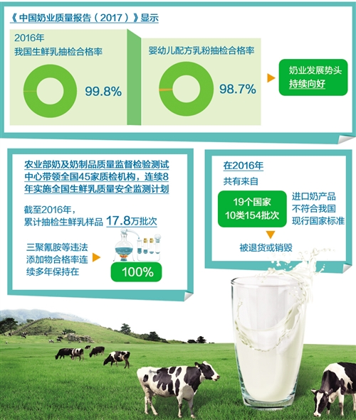 7月19日,由中国奶业协会和农业部奶及奶制品质量监督检验测试中心(北京)联合发布的《中国奶业质量报告(2017)》显示,2016年,我国生鲜乳抽检合格率99.8%,婴幼儿配方乳粉抽检合格率98.7%,奶业发展势头持续向好。