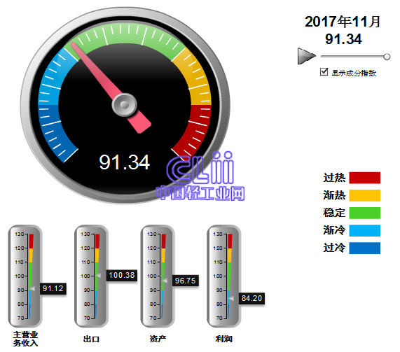 发布2017年11月中轻家具景气指数。11月,中轻家具景气指数91.34,其中:主营业务收入景气指数为91.12,出口景气指数为100.38,资产景气指数为96.75,利润景气指数为84.20(图1)。