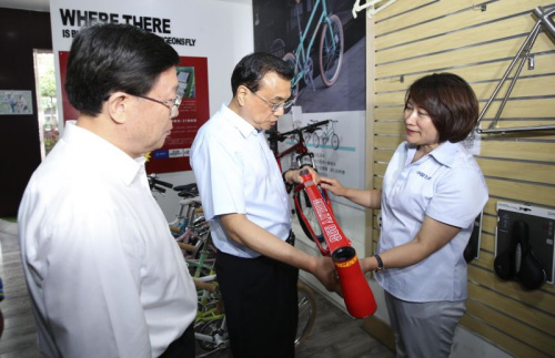 在出席夏季达沃斯论坛期间,中共中央政治局常委、国务院总理李克强在天津市委代理书记、市长黄兴国陪同下,在天津考察调研。6月26日走进飞鸽自行车天津胜利路体验店。这里摆放着不同档次、材质和性能各异的自行车。总理来到一辆碳纤维自行车前掂了掂重量,又亲自体验了一下这辆超级智能自行车的性能。他说,我愿为中国自行车做广告,更愿为“中国制造”智能升级“站台”。80年前,中国第一辆自行车在这家企业诞生。总理说,希望你们打造中国传统企业的“百年老店”。发扬勇于创新的企业家精神,追求精益求精的工匠精神,让老树不断发新芽,更加枝繁叶茂。
