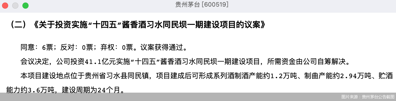值得一提的是,《意见》发布当日晚间,贵州茅台也发布公告称,公司决定投资41.1亿元实施“十四五”酱香酒习水同民坝一期建设项目,项目建设地点位于贵州省习水县同民镇,建设周期为24个月。据了解,项目建成后可形成系列酒制酒产能约1.2万吨、制曲产能约2.94万吨、贮酒能力约3.6万吨。