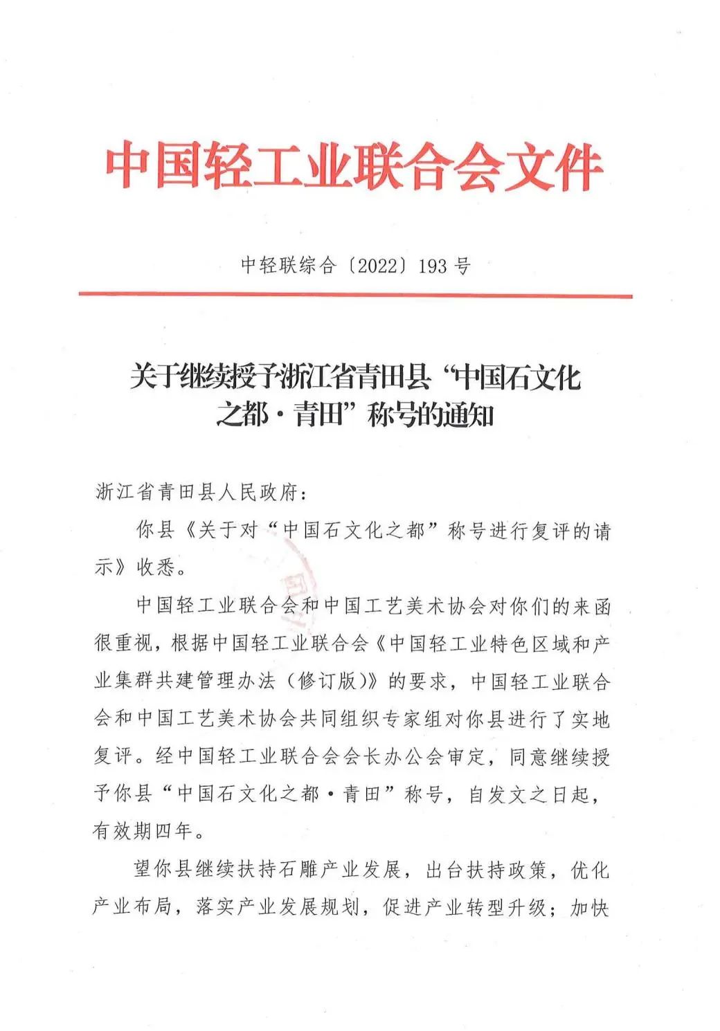 和中国工艺美术协会共同授予“中国石文化之都·青田”称号。2021年12月,经浙江省青田县人民政府申请,由