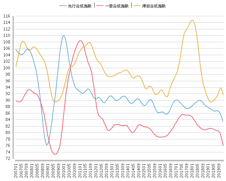 中国轻工业消费品行业景气指数显示, 2019年12月耐用消费品一致合成指数为76.09点(2010年=100), 比上月下降2.03点; 先行合成指数为83.55点(2010年=100), 比上月下降1.34点; 滞后合成指数为91.74点(2010年=100), 比上月下降1.69点。