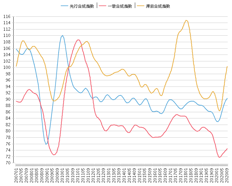 耐用消费品行业景气指数显示:2020年9月, 该行业一致合成指数为74.51点(2010年=100),比上月上升0.43点; 先行合成指数为90.32点(2010年=100), 比上月上升0.71点; 滞后合成指数为100.35点(2010年=100), 比上月上升2.18点。