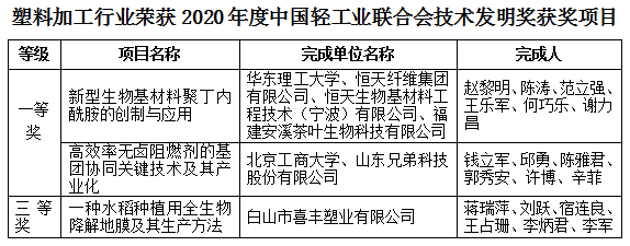 大会还对第二批轻工大国工匠,2020年度 科学技术发明奖、进步奖获得者和全国联社系统先进集体进行了表彰。其中塑料加工行业的天津军星管业集团有限公司董事长夏成文、金后盾集团董事长李彦平荣获“第二批轻工大国工匠”称号;3个塑料加工行业相关项目获得2020年度 技术发明奖;15个塑料加工行业相关项目获得2020年度 科技进步奖。此外还有部分塑料行业企业当选 第五届副会长、常务理事和理事单位。