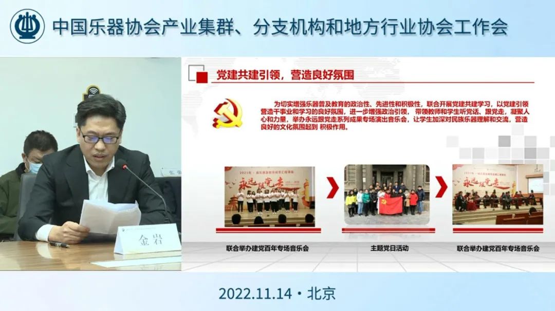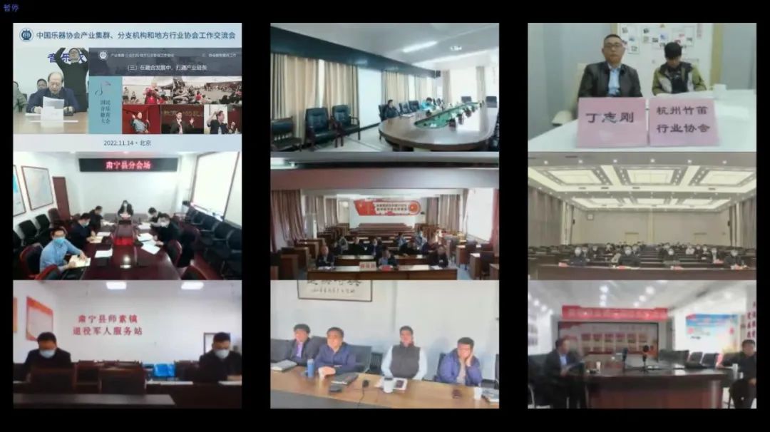 2022年11月14日,中国乐器协会产业集群、分支机构、地方行业协会工作会议在京召开。分布在上海、江苏、浙江、贵州、河北、山东、北京、广州等地的产业集群、分支机构、地方行业协会及乐器企业代表等,共78个终端130余人线上参加会议。