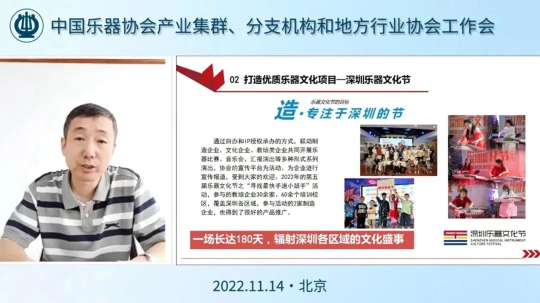 随后,民族乐器分会秘书长周力,从“以文化活动为切入点,传承民乐文化;以高质量产品为立足点,塑造品牌自信;以培育工匠队伍为核心点,传承文化技艺”等三个方面,分享了以上民一、乐海、苏民一、扬州金韵乐器御工坊为代表的民族乐器企业的一些好做法,好经验,值得分支机构学习参考。多年来,器乐文化专委会一直在乐器进校园这个领域里深耕。他们在实践中探索出的校会合作1+5模式,将乐器学习、乐器文化乃至乐器制造,成功地引入高校,并纳入课程体系,对乐器企业极具示范意义。器乐文化专业委员会秘书长金岩详细介绍了分会在进校园专项工作的做法与经验。最后,地方乐器协会代表——深圳市乐器行业协会秘书长解春辉介绍了近年来该协会的主要工作和成果。他表示,深圳乐器协会始终将协会的策划、活动以及工作的着力点,与深圳当地的社会经济文化发展紧密融合,并充分利用属地文化资源,拓展自身工作手臂,并不断扩大影响,增强协会凝聚力,助力地方乐器产业发展。