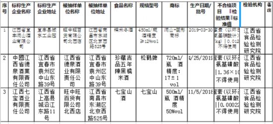 通报显示,标称江西省宜丰洞山酒业有限公司生产的“洞山”牌糯米冬酒(450ml/瓶,酒精度≥12%vol,2019-03-30),检出甜蜜素0.0128g/kg;标称中国江西省德泉酒业有限责任公司生产的“松鹤牌”珍藏吉品五年陈黑糯米酒(720ml/瓶,酒精度:17±1vol,2019/4/25),检出甜蜜素0.00136 g/kg;标称江西七宝酒业有限责任公司生产的“七宝山”酒(500ml/瓶,酒精度50%vol,2018/11/5),甜蜜素检出值为0.00022 g/kg。