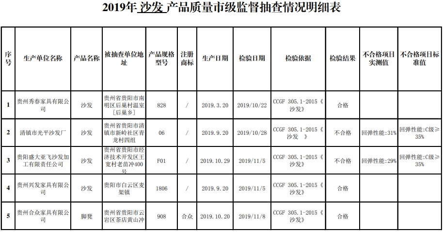 2020年4月7日,贵阳市市场监督管理局网站发布关于2019年沙发产品质量监督抽查结果公告。