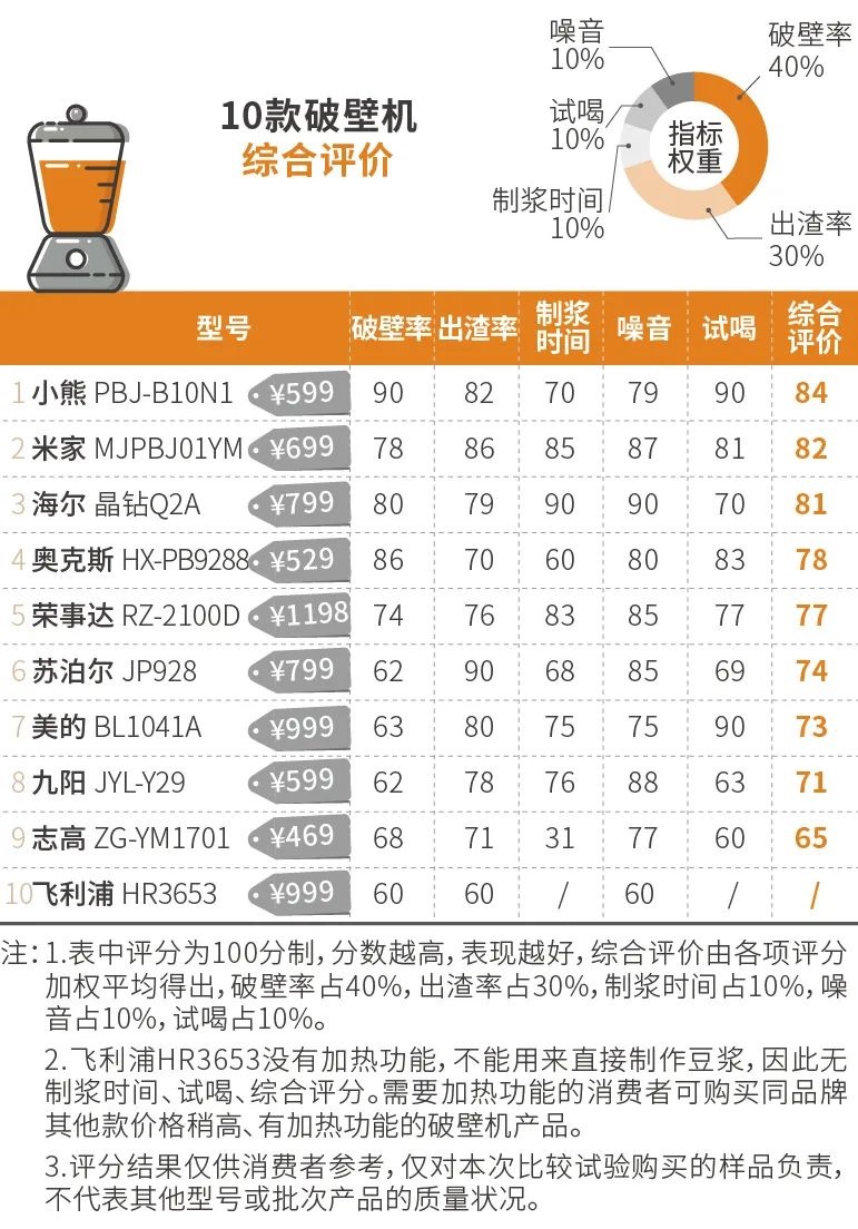 综合破壁率、出渣率、制浆时间、噪音、试喝等5项指标,得出10款破壁机的综合评分。小熊、米家表现较佳。小熊 PBJ-B10N1破壁效果出色,榨出的豆浆较受试喝志愿者的喜爱;米家 MJPBJ01YM各项表现均衡,出渣较细,噪音较低,体验优秀。