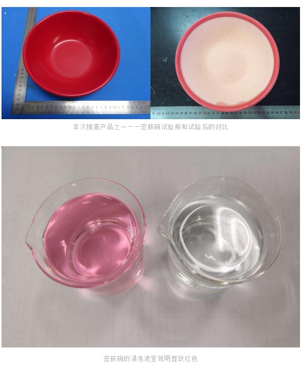 有2批次产品总迁移量不合格,且数据超标严重。4批次特定迁移总量(以甲醛计),3批次产品高锰酸钾消耗量不合格,其中还有一批在试验过程中发生严重的脱色,质量堪忧。该批次不合格样品在浸泡试验后从一个“红碗”变成了一个“白碗”。