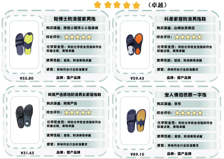 根据国务院办公厅印发《消费品标准和质量提升规划(2016-2020年)》(国办发[2016]68号)“建立企标领跑者制度,引导消费者更多选择标准领跑者产品”的要求。为营造“生产看领跑,消费选领跑 ”的氛围,根据比较试验相关规则评选出9款符合本次比较试验制定的更多更严标准要求品质领跑的塑料拖鞋,分别是:科柔家居防滑男拖鞋、鞋博士防滑居家男拖、网易严选抓地防滑男女家居拖鞋、宝人情侣低跟一字拖、朴西简约日式家居浴室男士拖鞋、南极人居家拖鞋、george.防滑女拖鞋、miniso简约条纹舒适底女士浴室拖、卡骆驰休闲拖凉鞋。其中,国产品牌为6款,科柔、鞋博士为深圳品牌。