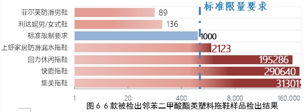 1.6款塑料拖鞋样品被检出含邻苯二甲酸酯类塑化剂,4款样品超出欧盟标准限量要求。