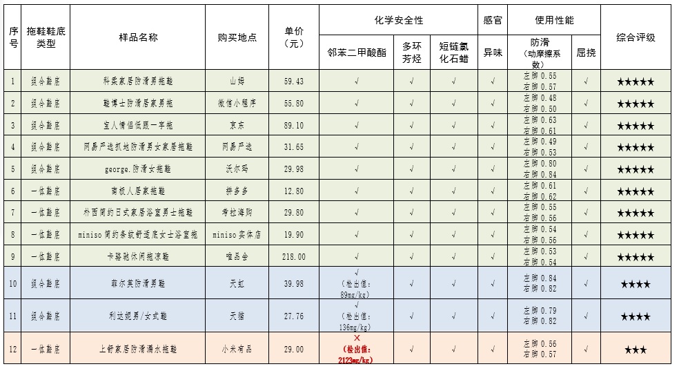 2020年塑料拖鞋比较试验总评表