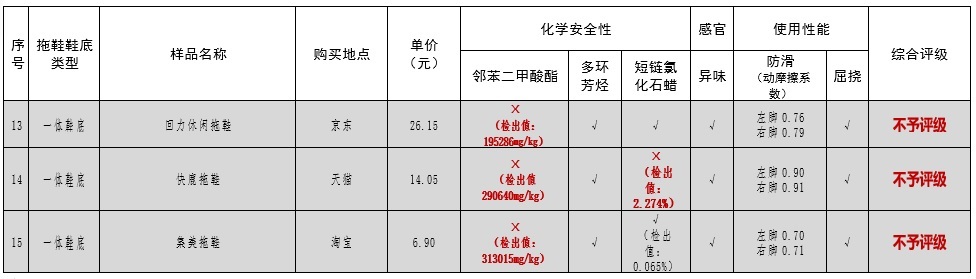 本次比较试验对15款塑料拖鞋进行检测,从检测结果总体来看,15款塑料拖鞋所检的使用性能及感官指标均符合我国现行 标准及化工行业标准要求,部分产品的化学安全性未满足欧盟法规的相关要求,例如邻苯二甲酸酯类、短链氯化石蜡等指标,使用性能整体表现优秀。具体检测结果及分析如下: