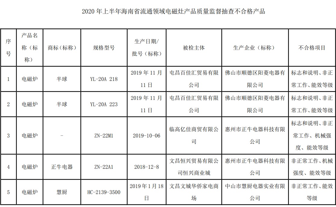 2020年7月17日,海南省市场监督管理局网站公布2020年上半年海南省流通领域电磁灶产品质量监督抽查结果。本次抽查了28批次产品,经检验,不合格5批次。