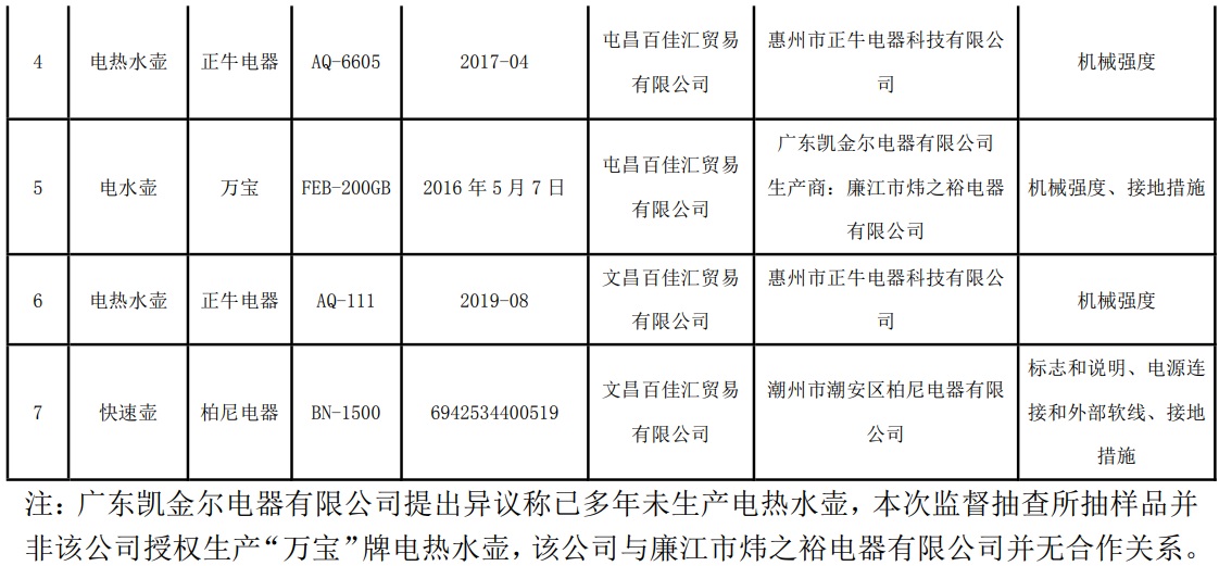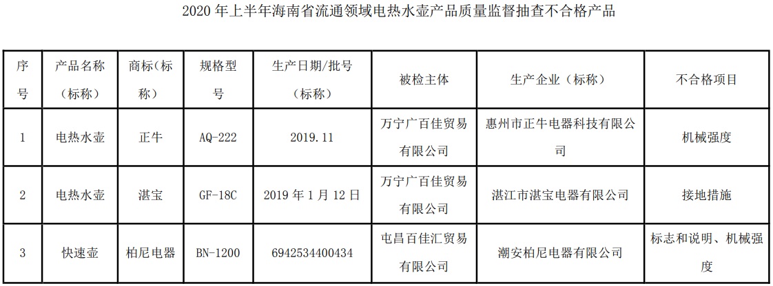 2020年7月17日,海南省市场监督管理局网站公布2020年上半年海南省流通领域电热水壶产品质量监督抽查结果。本次抽查了33批次产品,经检验,不合格7批次。