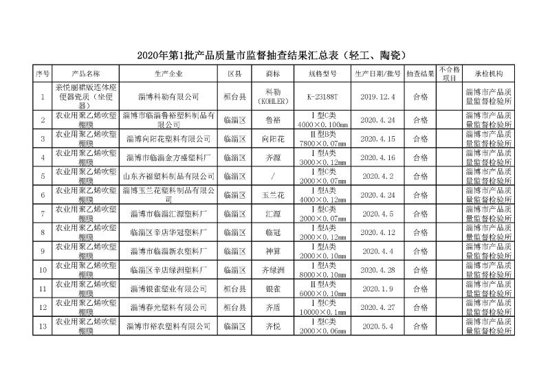 据山东淄博市市场监督管理局网站8月25日消息,2020年4月至7月,该局组织对轻工类产品和陶瓷产品开展产品质量监督抽查。本次共抽查了46家企业生产、销售的46批次产品,合格44批次。