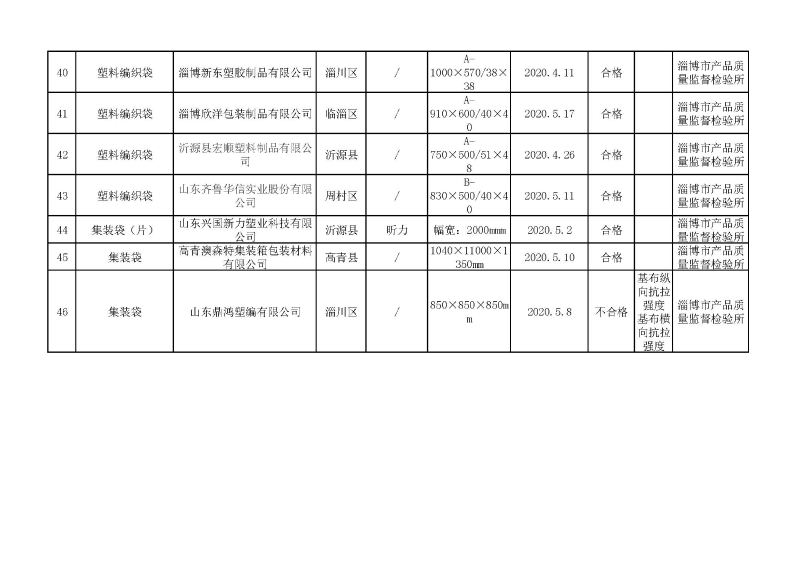有1批次集装袋产品判定为不合格,不合格项目为:基布纵向抗拉强度、基布横向抗拉强度。不合格原因分析:原材料质量未能实施有效控制导致丝的拉力不够,基布的每平方克重不达标,经纬密度不够。