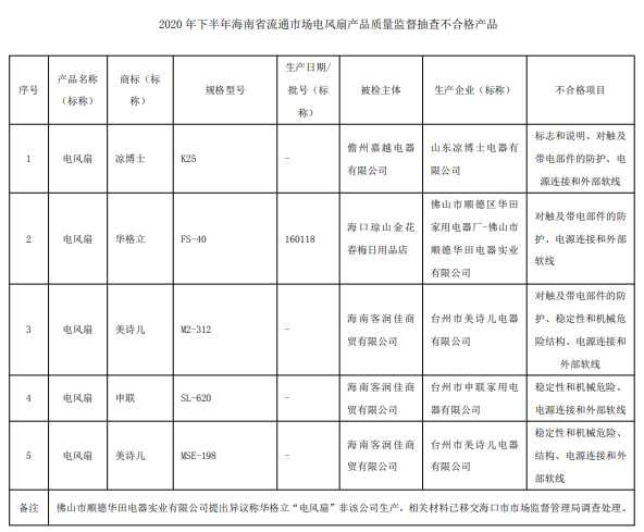 海南省市场监管局:5批次电风扇产品抽查不合格