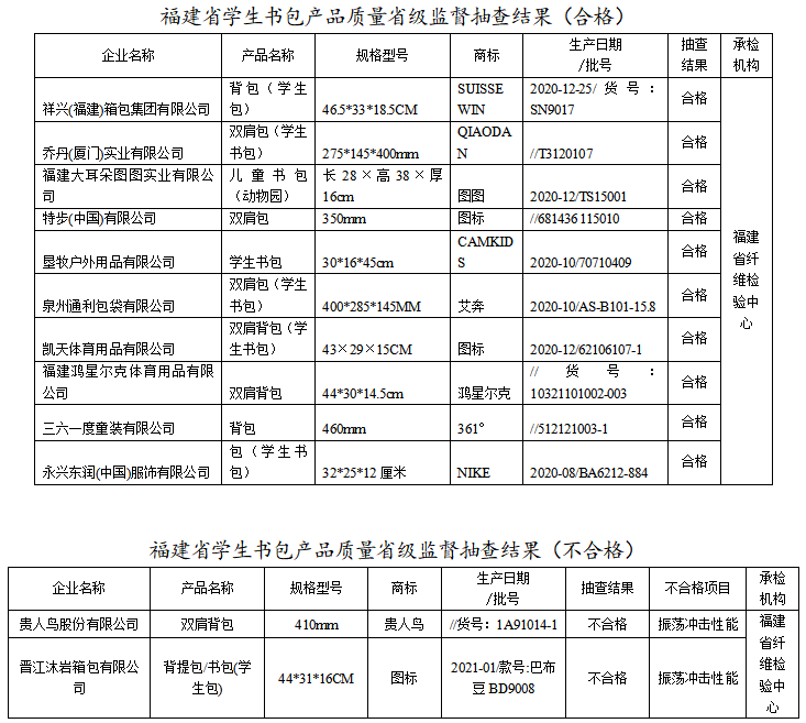 近期,依据《中华人民共和国产品质量法》,福建省市场监督管理局组织对学生书包、学生文具开展产品质量省级监督抽查,共抽查学生书包12家生产企业12批次产品,不合格2批次,不合格发现率为16.67%;抽查学生文具15家企业15个批次产品,不合格1批次,不合格发现率为6.67%。