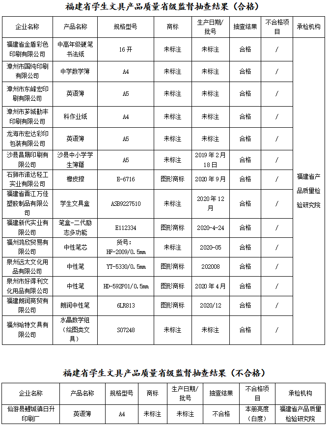 福建省市场监督管理局对学生书包、学生文具抽检3批次不合格
