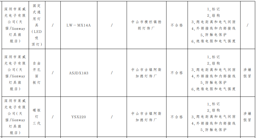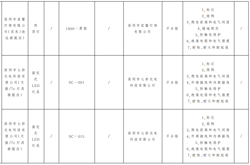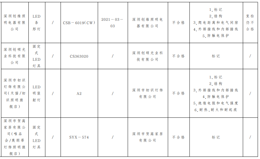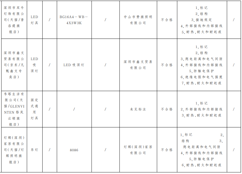 近日,深圳市市场监管局发布2021年个护健康器具等11类产品质量监督抽查结果。本次抽查了深圳市71家受检单位生产、销售的117批次灯及灯具产品,发现不合格产品28批次。其中,生产领域抽查了32家企业的54批次产品,发现不合格产品3批次;流通领域(实体店)抽查了12家企业的27批次产品,未发现不合格产品;流通领域(网络交易平台)抽查了27家企业的36批次产品,发现不合格产品25批次。